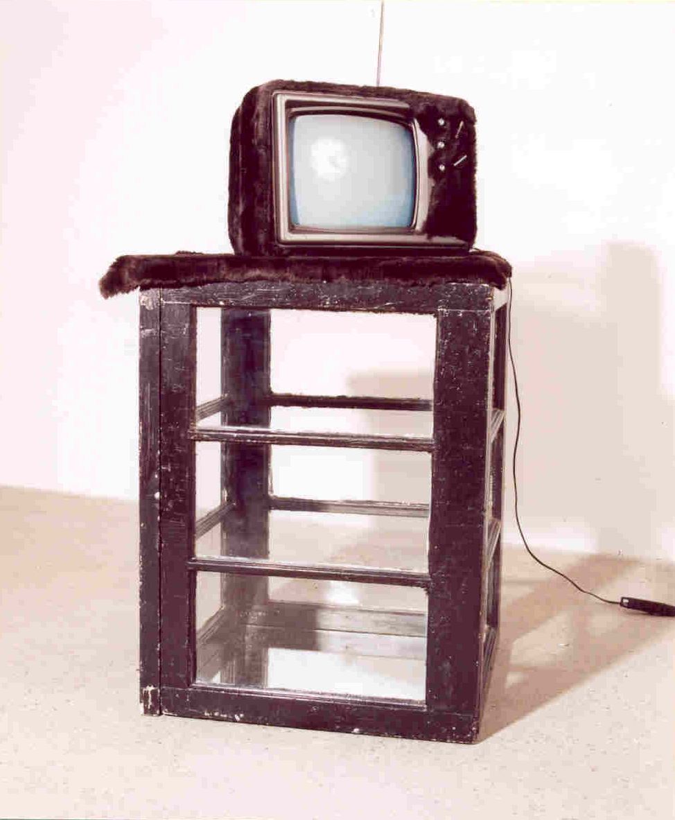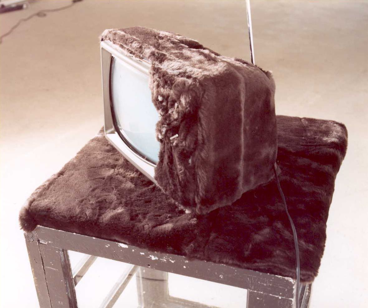 "The Medium and the message", an innocuous and innocent looking entertainment centre, the television sits there covered in fur like some comforting toy used to distract and mesmerize children. The artist has presented this installation in a way that is loaded with meaning and encourages the viewer to question the role of television. The base itself relates to the theme. Like the television, which gives us a window on the world and events, these windows face each other with inward containment, reflecting upon one another. The mirror in the centre presents a tunnel vision continuing downward. The medium while appearing to expand our view, actually contracts it to the viewpoints selected by the producers who reinforce the hegemony of the corporate agenda. While television expands our view at the global level, it replaces interaction and communication at the local level. The incongruity of a fur-covered domestic object is nothing new to art history. Merit Oppenheim presented her fur cup and saucer to the art world years ago.